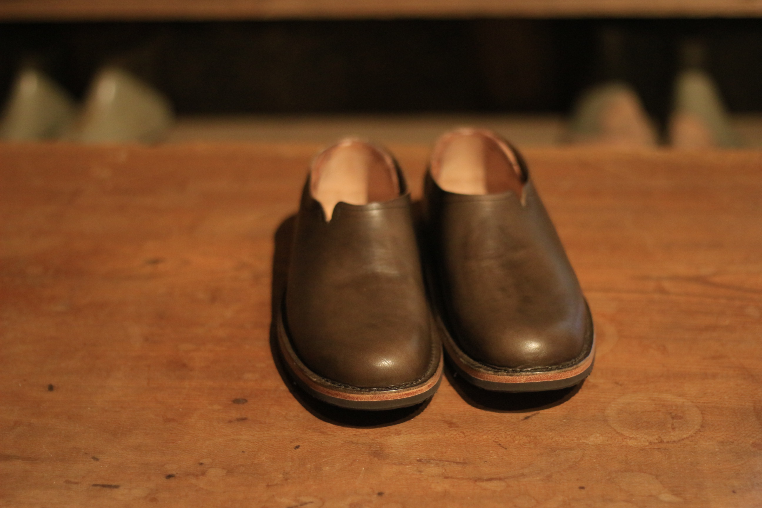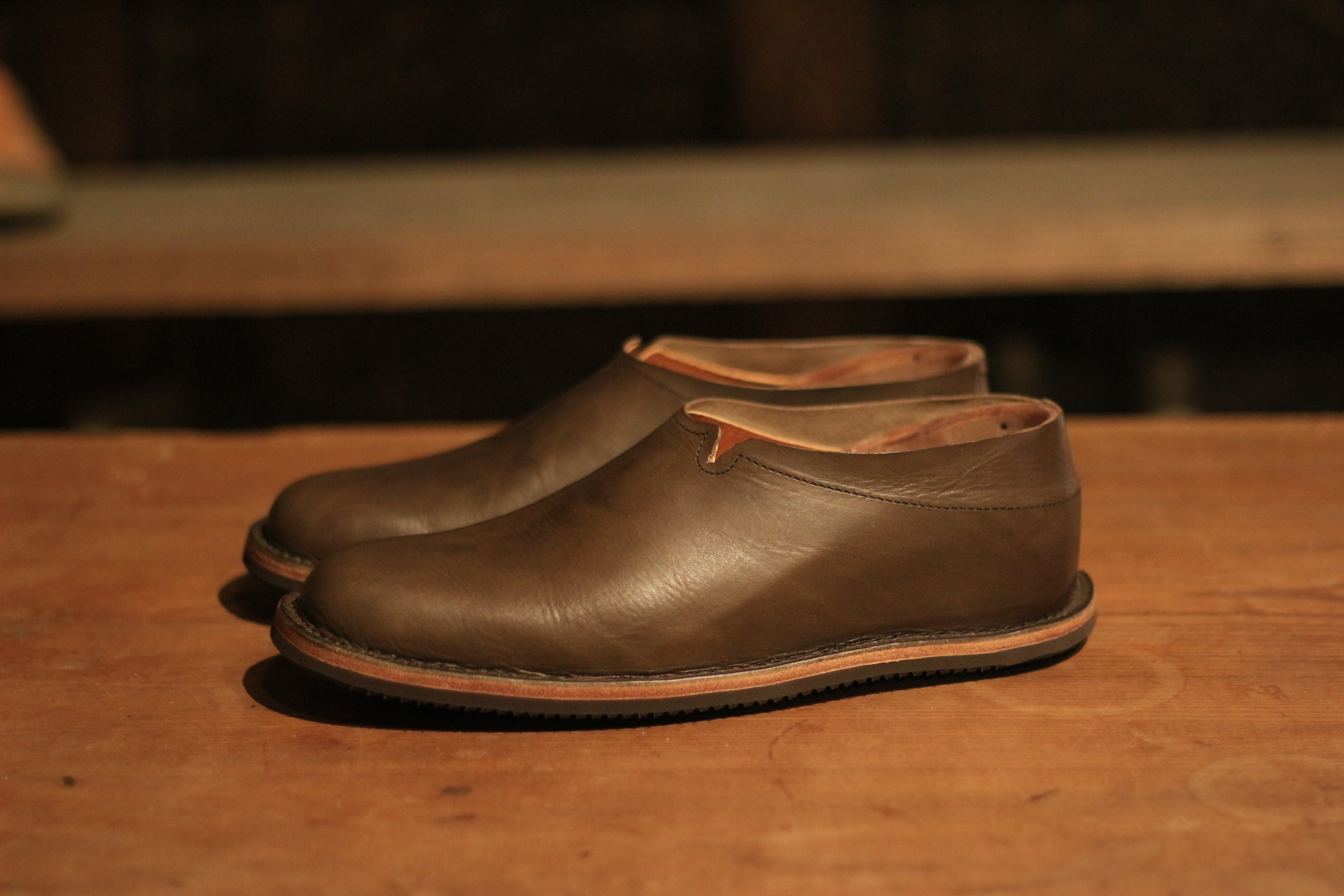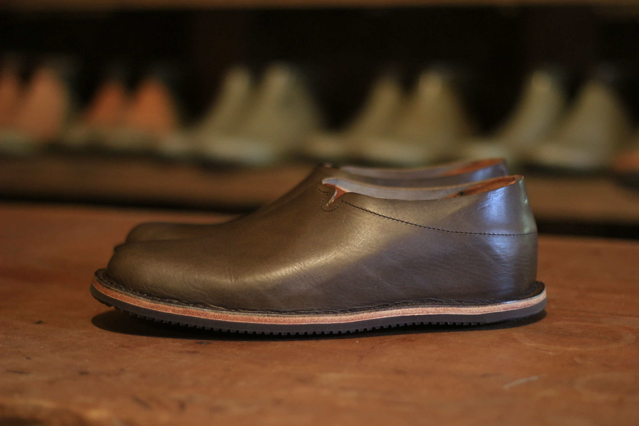 いつもはシュリンクレザーを使うCRAFTだが お客様のご要望でイタリアのバゲッタレザーで製作。 伸びの少ない革なので、履き口を少し工夫。 実はそれで一度試してもらったのだが、 それだけではまだ履き口が狭くて足が入らず、申し訳ないことをした。