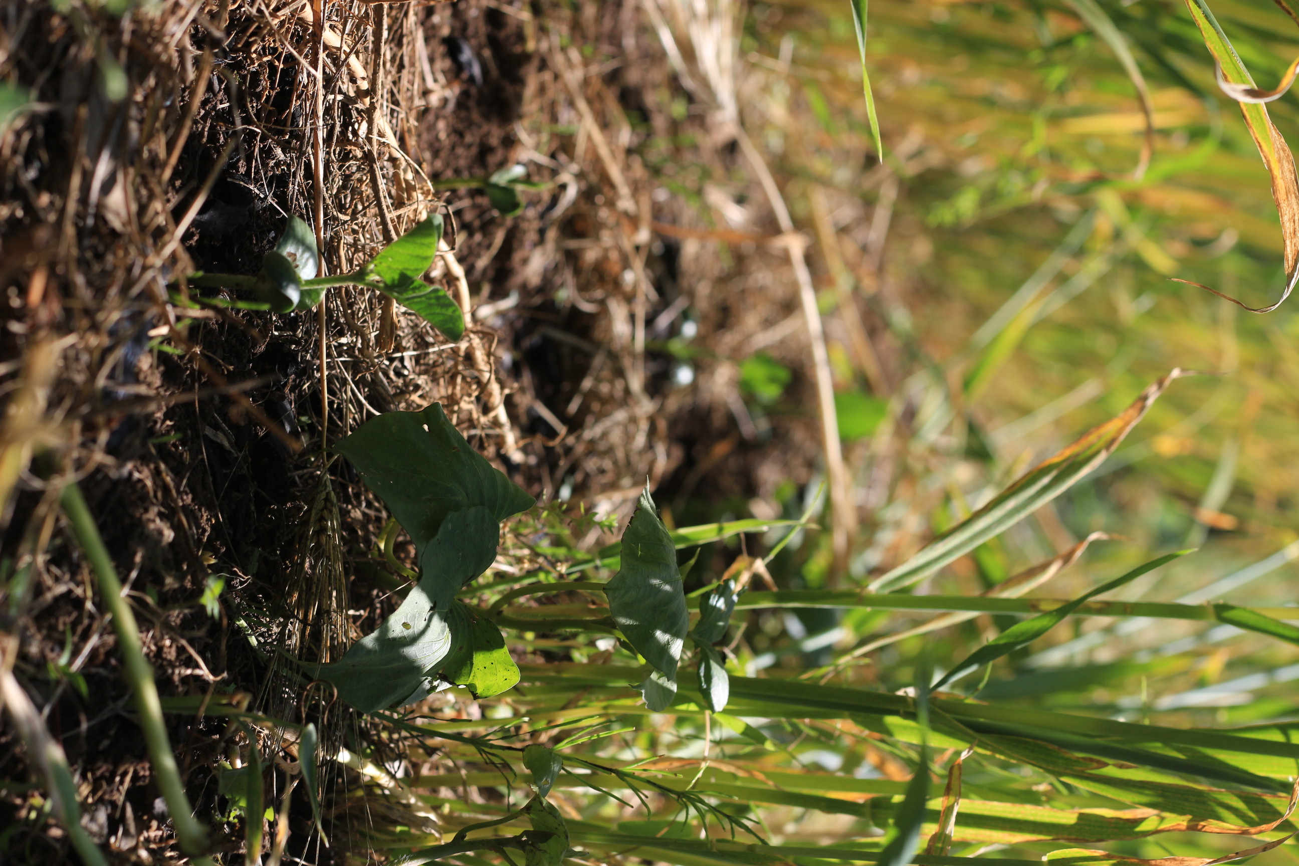 その大麦の木陰で気持ちよさそうなサツマイモと枝豆の若葉。