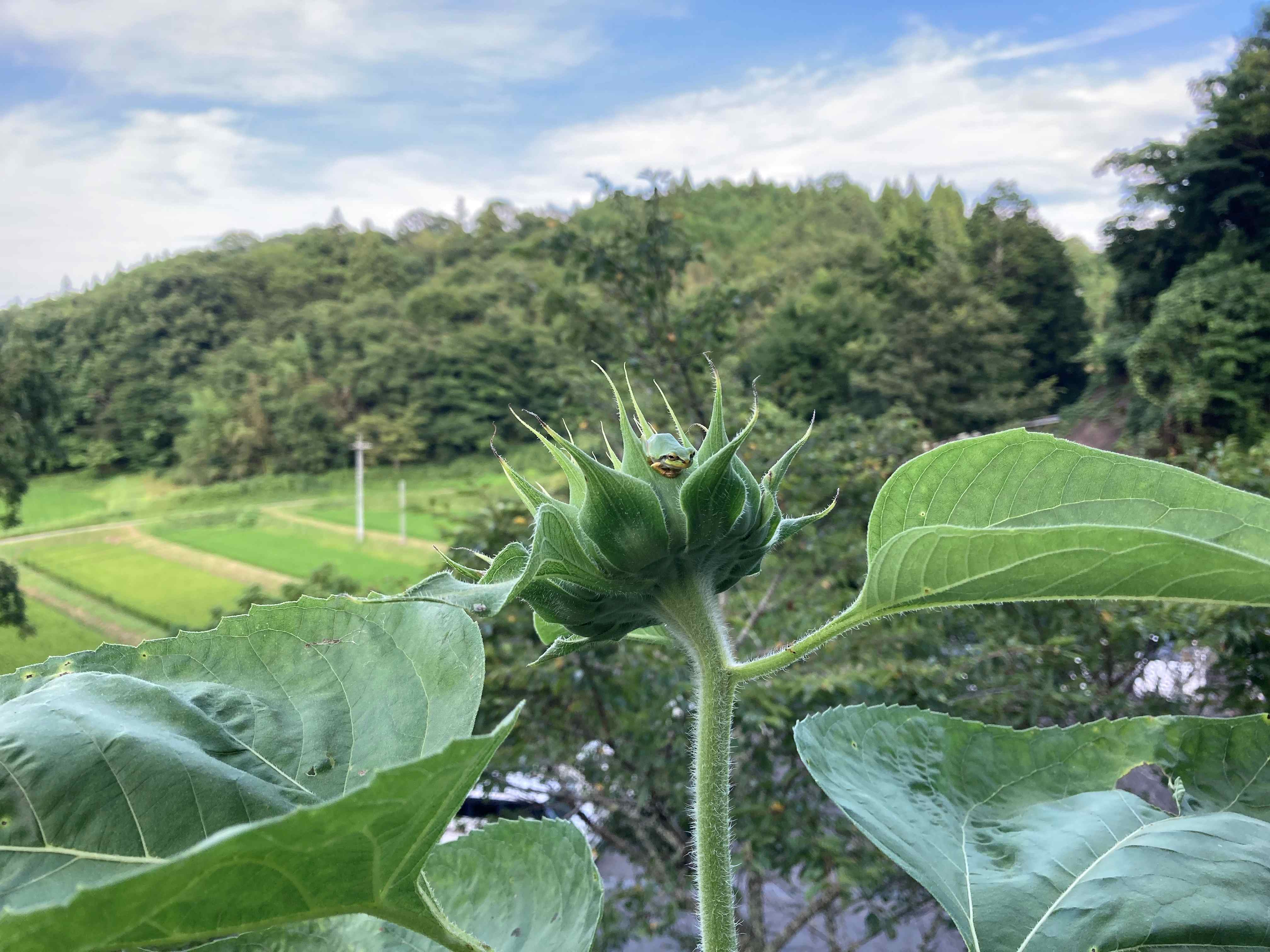 大きなヒマワリのてっぺん。最高の見晴らしだけど、反対向いてます。