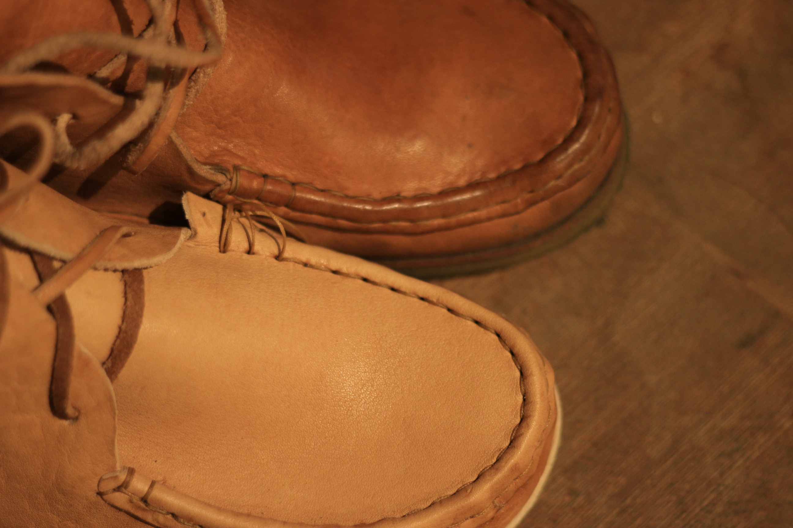 モカシンの革は非染色です。 ブラウンとか黒とか、染色を考えましたが、染めないことに決めました。 僕にとって、 この靴は田んぼや畑や森に入るための道具だからです。