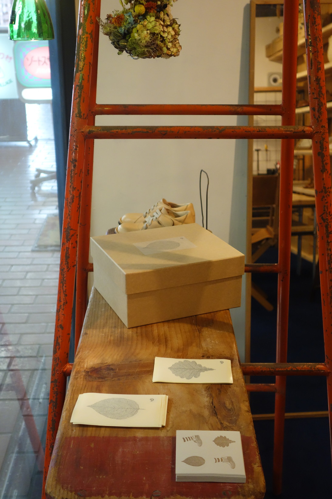 今日の分室のショーウインドウには 子ども靴と箱とシールを展示しました。